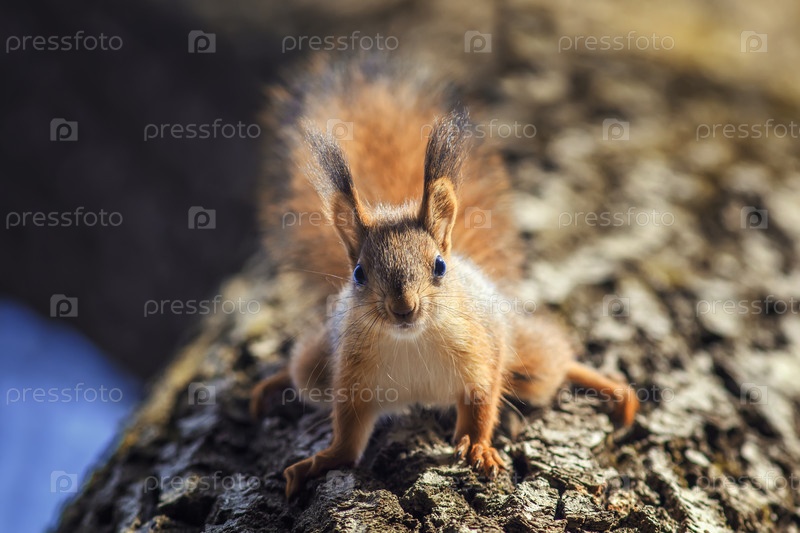 Милая пушистая белка спускается по стволу дерева в парке
