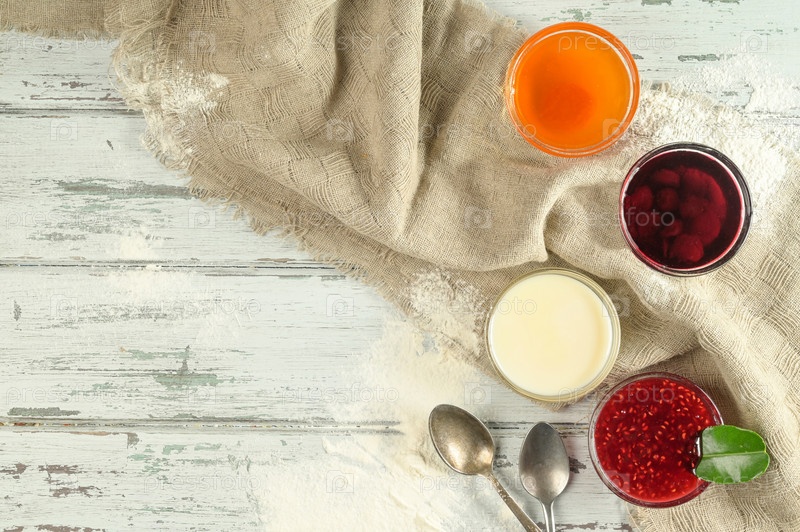 Джем на белом деревянном столе персик, малина, ягоды