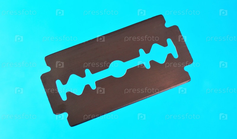 Лезвие бритвы на синем фоне. Металлическая пластина, для удаления волос, имеет две заточенные режущие кромки, устанавливается в бритвенный станок