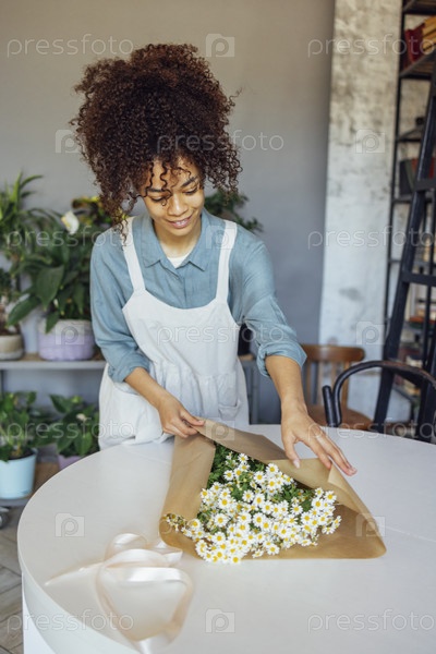 Молодой флорист в фартуке создает красивый простой букет ромашек из крафтовой бумаги