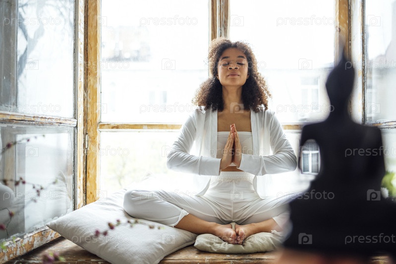 Афроамериканская этническая женщина в белой одежде сидит в позе йоги