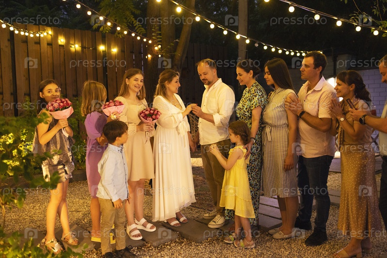 Невеста, жених, шафер, подружки невесты вокруг. Празднование свадьбы на открытом воздухе