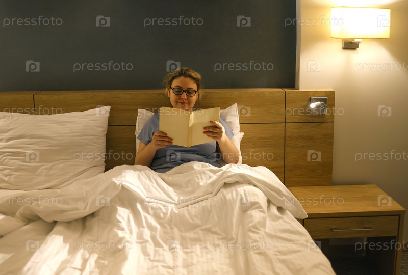 Кавказская женщина средних лет читает книгу, сидя на кровати в спальне