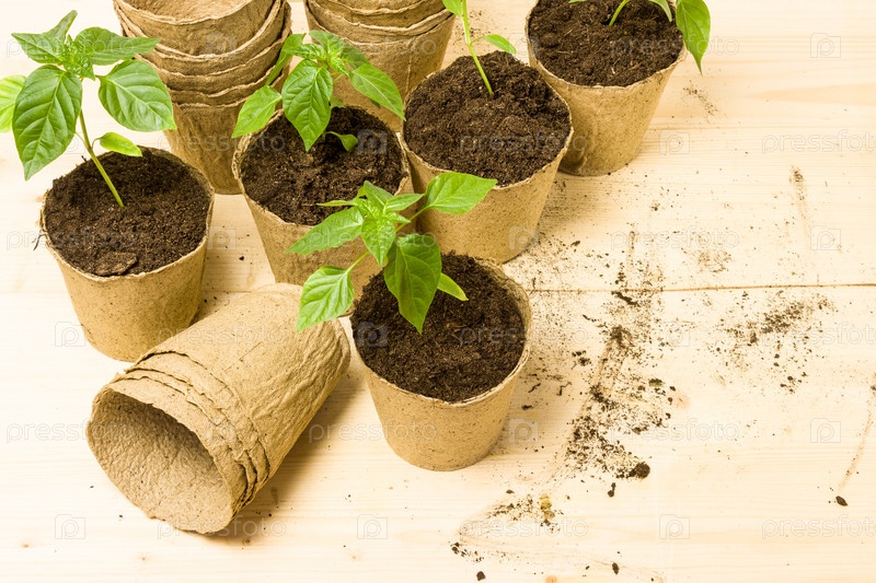 Рассада перца в горшках в торфяных горшочках и пластиковом контейнере. Садоводство весной. Молодые саженцы в горшках