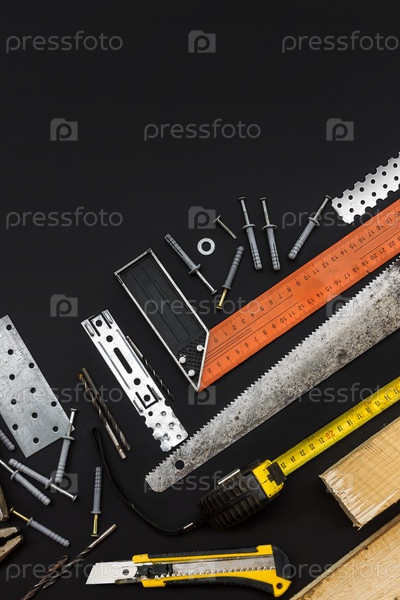 Инструменты для различных видов работ. Черный фон. Вид сверху. Копировать пространство