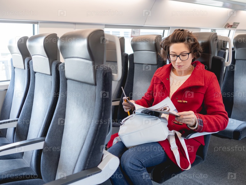 Женщина в красном дафлкоте читает журнал в пригородном поезде. Информация в печатных СМИ. Путешествие на наземном транспорте