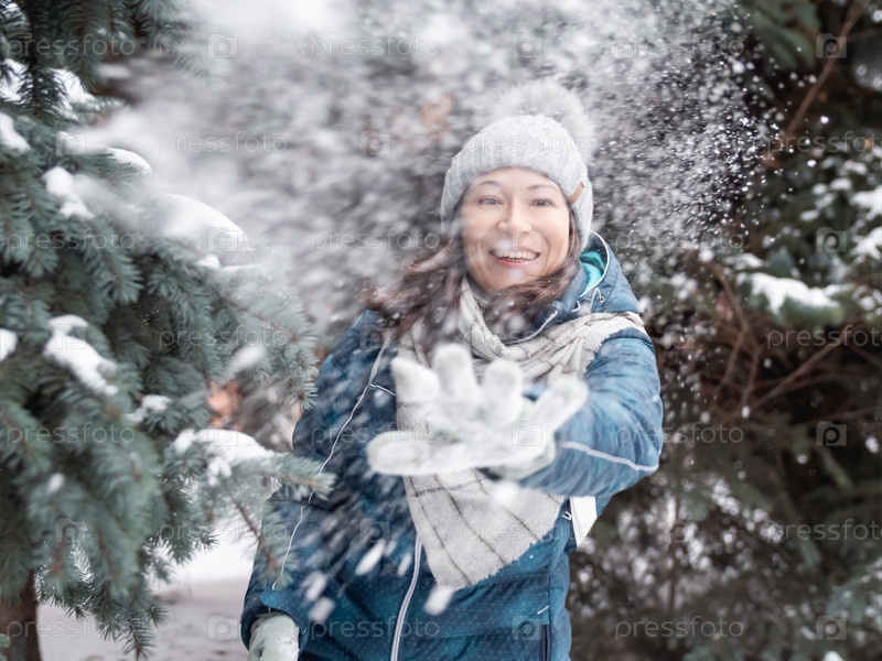 Улыбающаяся женщина в вязаной шапке играет со снегом. Веселье в парке между заснеженными елями. Женщина смеется, бросая снежок. Холодный сезон