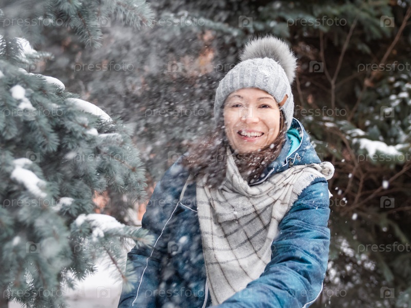 Улыбающаяся женщина в вязаной шапке играет со снегом. Веселье в парке между заснеженными елями. Женщина смеется, бросая снежок. Холодный сезон