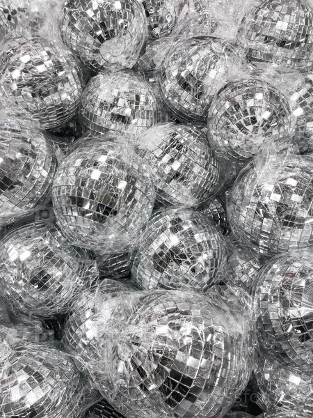 Продажа маленьких диско-шаров в полиэтиленовых пакетах для елки. Декоративные зеркальные шары для празднования Нового года в магазине. Праздничный шопинг. Монохромный фон