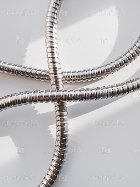 Металлический шланг для душа на белом фоне. Гибкая хромированная трубка. Гофрированная водопроводная труба на геометрическом баннере с копией пространства на жестком солнечном свете и тени
