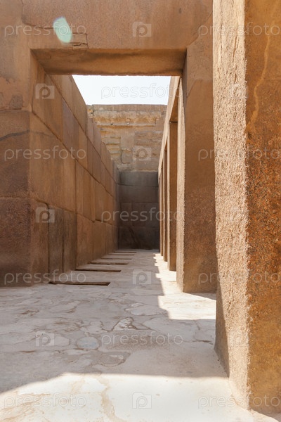 Бежевые каменные стены коридора возле Великой пирамиды Гизы, Египет. Архитектурная достопримечательность Африки