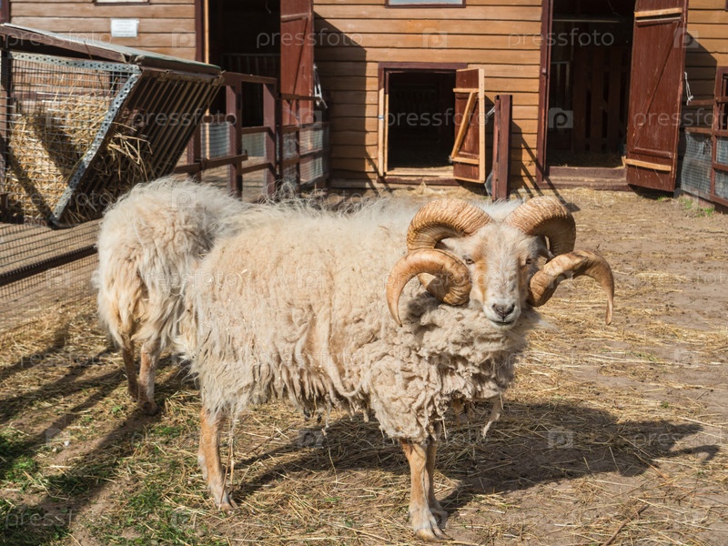 Портрет самца мини-овцы или овца Овиса. Пушистое животное в загоне возле сарая. Животноводство