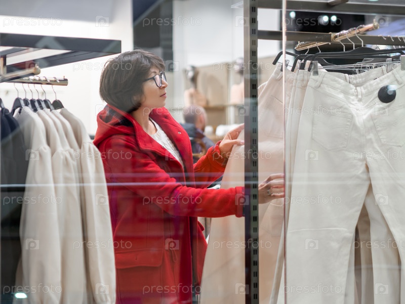 Женщина выбирает брюки в магазине одежды. Повседневные брюки висят на вешалках. Вид через прозрачную витрину. Покупки в торговом центре. Базовая одежда для повседневной носки. Современная городская мода