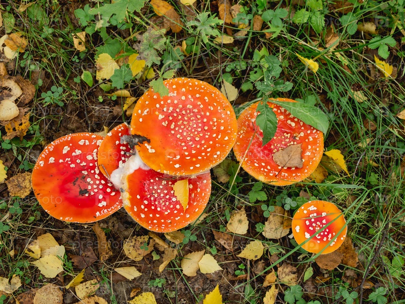 Вид сверху на опасные и ядовитые грибы-мухоморы, растущие среди травы