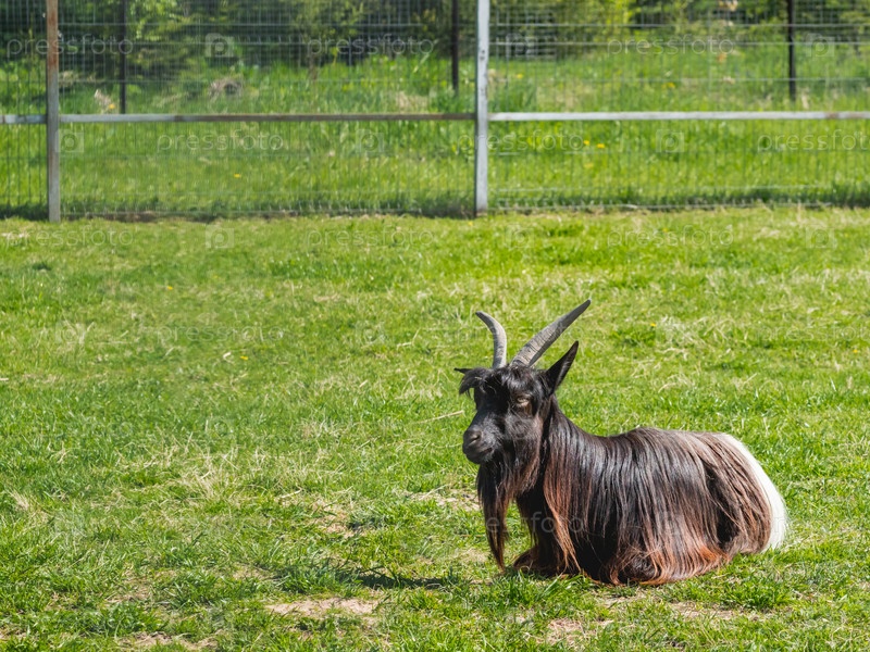 Capra Aegagrus Girgentana или черная коза Вале. пушистое животное в клетке возле двора. скотоводство