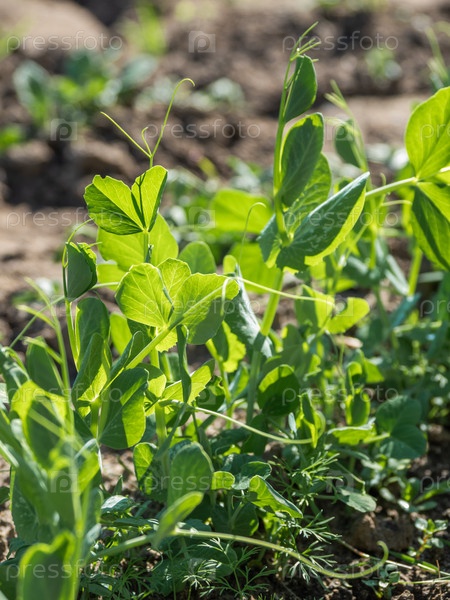 Рассада зеленого горошка в открытом грунте. Зеленые свежие листья съедобного растения. Садоводство весной и летом. Выращивание органических продуктов