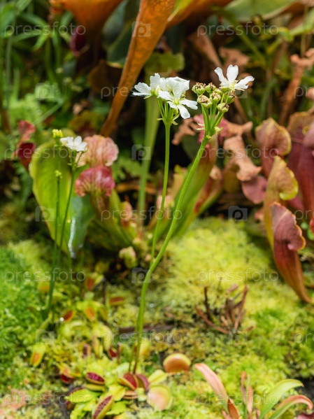 Венерина мухоловка или Dionaea muscipula - белые цветы цветящего плодоядного растения