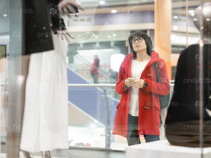 Женщина смотрит на манекенов в магазине одежды. Повседневная одежда висит на манекенах. Вид через прозрачную витрину. Покупки в торговом центре. Базовая одежда для повседневной носки. Современная городская мода