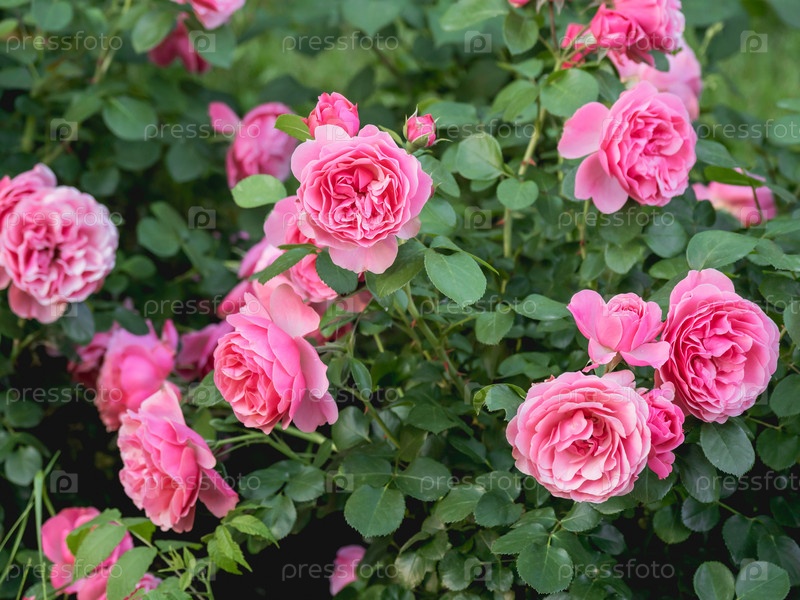Естественный летний фон с густыми розовыми розами на кустарнике. Красивые цветущие цветы на фоне зеленых листьев