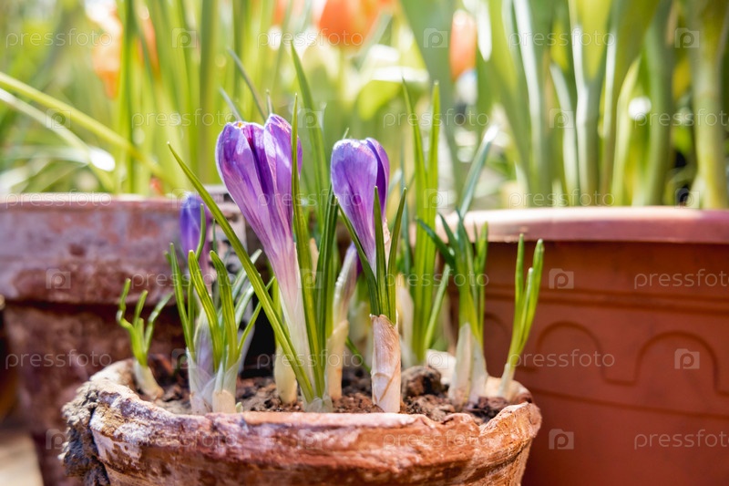 Цветы крокуса пробиваются сквозь землю в цветочном горшке. Выращивание цветов весной как антистрессовое хобби. Природный весенний фон
