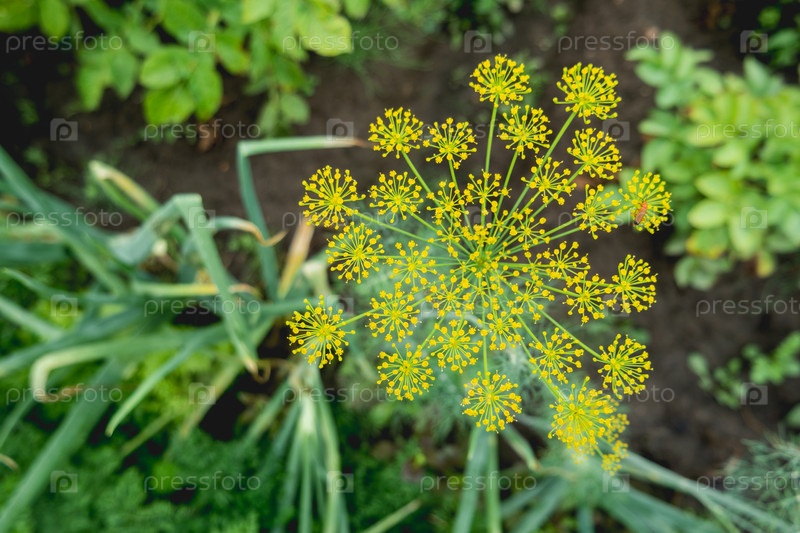 Желтые цветы укропа или Anethumgraveolens. Садоводство под открытым небом. Сельское хозяйство на приусадебном участке. Выращивание органических овощей и трав в теплицах и на свежем воздухе