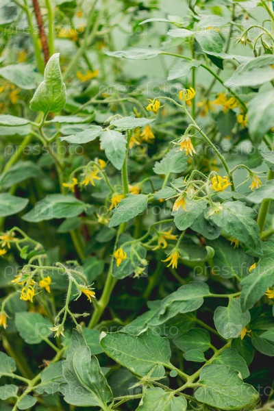Желтые цветы помидоров на кусте. Садоводство на открытом воздухе. Сельское хозяйство на приусадебном участке. Выращивание органических овощей в теплицах и на открытом воздухе
