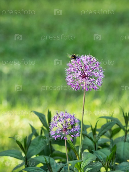 Шмель собирает пыльцу с пурпурного культивируемого лука. Естественный летний фон с цветущими цветами и насекомыми