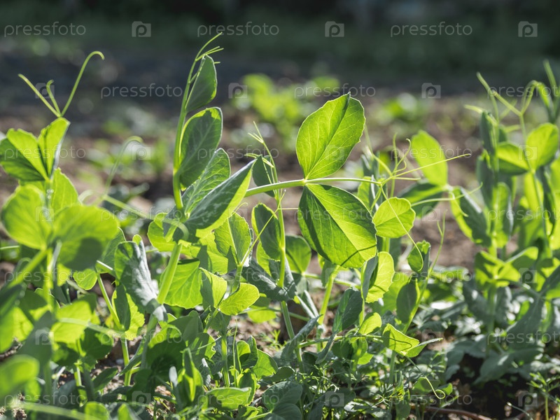 Рассада зеленого горошка в открытом грунте. Зеленые свежие листья съедобного растения. Садоводство весной и летом. Выращивание органических продуктов