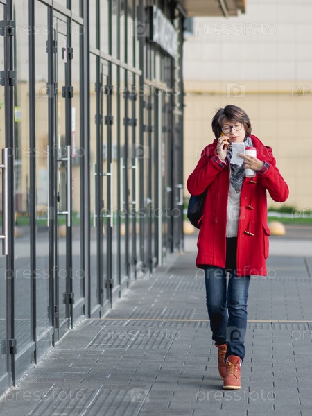 Женщина в красном дафлкоте разговаривает по смартфону. Женщина идет по улице с чашкой кофе на вынос и бумажным чеком