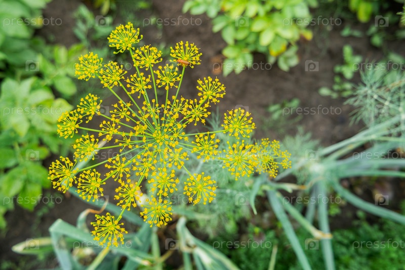 Желтые цветы укропа или Anethumgraveolens. Садоводство под открытым небом. Сельское хозяйство на приусадебном участке. Выращивание органических овощей и трав в теплицах и на свежем воздухе