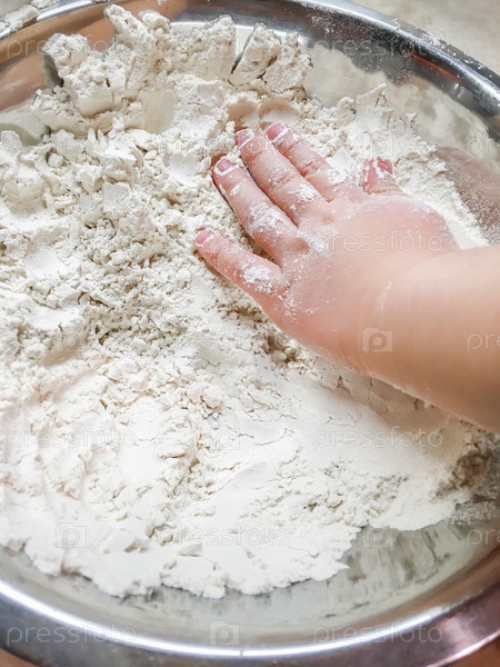 Маленький ребенок трогает муку в металлической миске. Готовим с детьми. Развивать мелкую моторику, позволяя прикасаться к пищевым ингредиентам
