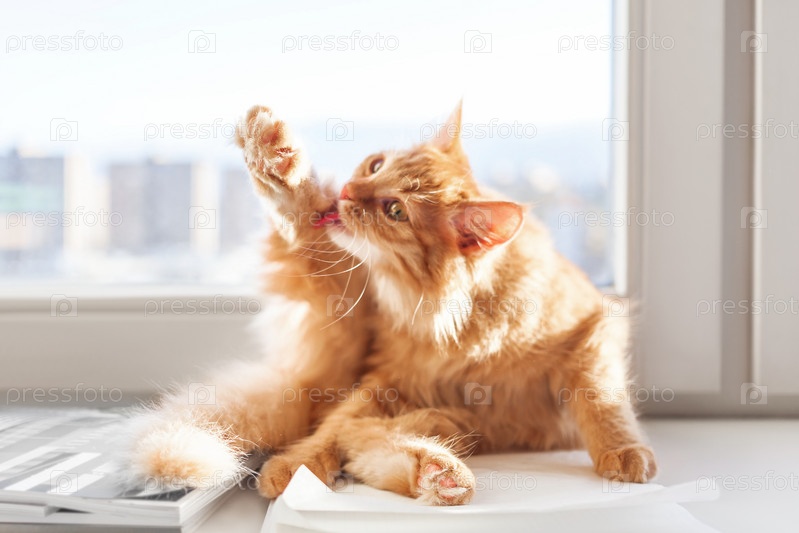 Милый рыжий кот любит лапы на подоконнике. Пушистый питомец чистит мех на солнце. Пушистое домашнее животное