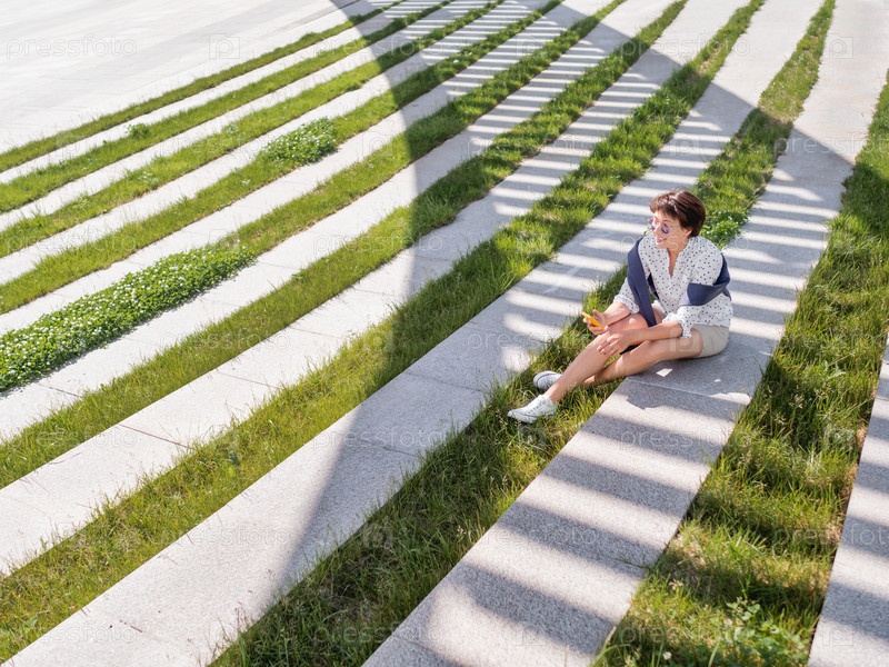 Женщина пишет смс в своем смартфоне, сидя на скамейке в городском парке. Полосатая тень на зеленой лужайке. Современный образ жизни миллениалов