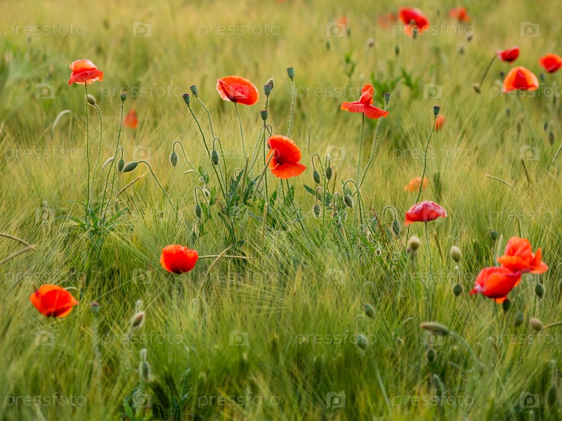 Красные цветы мака на ржаном поле. Зеленые растения с красными бутонами. Красивые и хрупкие цветы летом