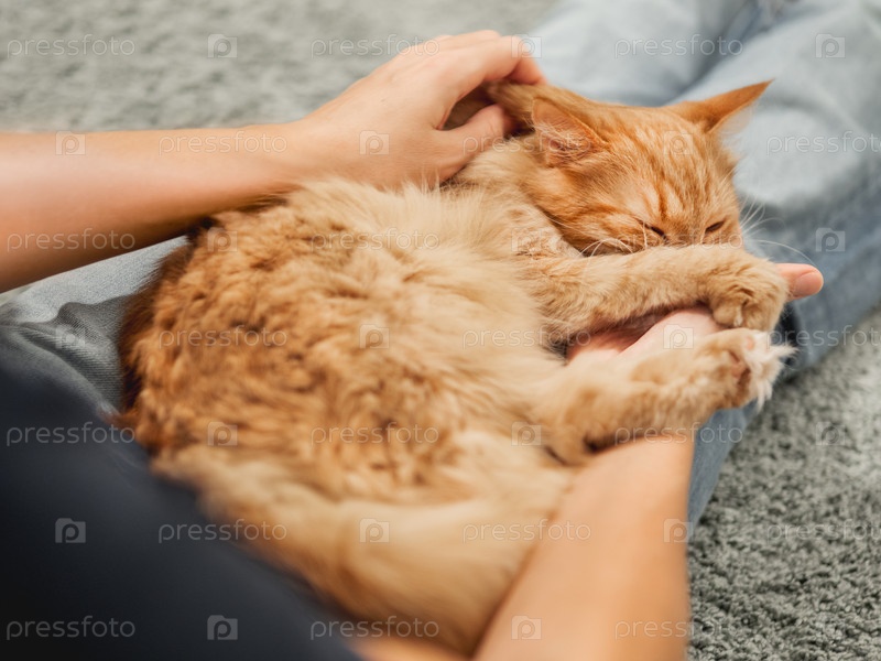 Милый рыжий кот спит на коленях у женщины. Пушистый питомец уютно расположился на ногах хозяина