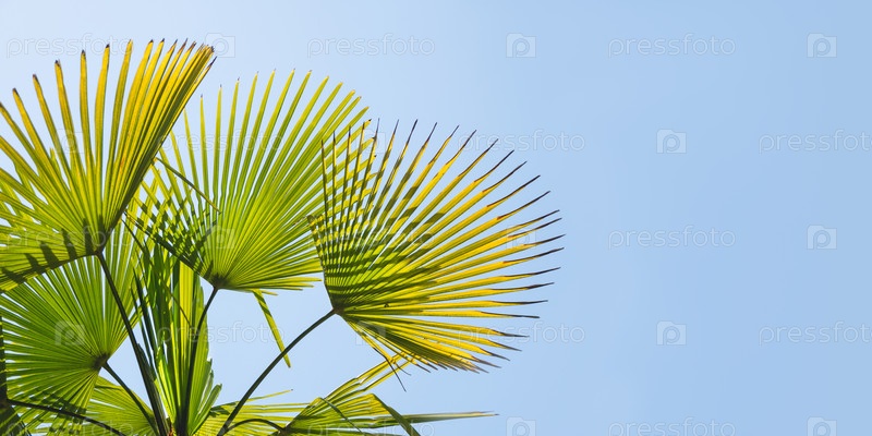 Солнце светит на пальмовых листьях. Тропическое дерево со свежей зеленой листвой. Чистый фон голубого неба. Горизонтальный баннер с копией пространства