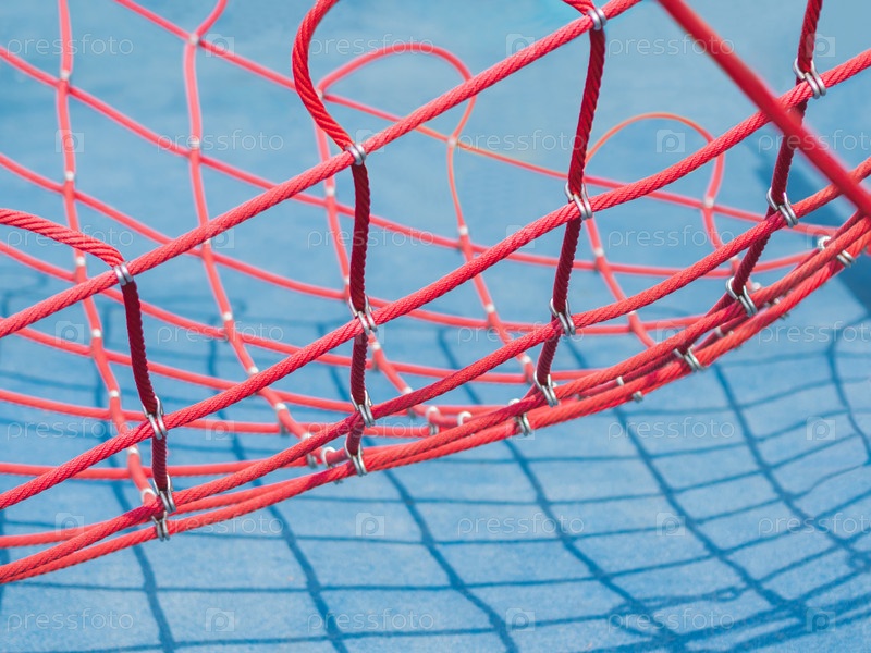 Красная сетка на синем фоне. Спортивное оборудование на общественной спортивной площадке в солнечный день. Геометрические тени в солнечный день
