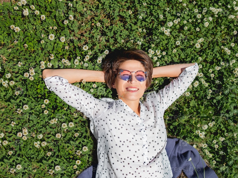 Вид сверху на женщину, лежащую среди цветов клевера на лужайке в городском парке. Природа в городе. Отдохните на свежем воздухе после работы. Летние вибрации