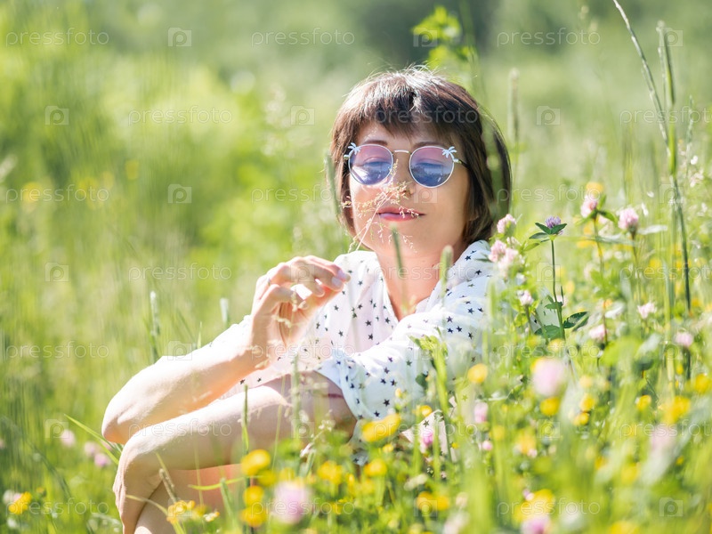 Женщина в красочных солнцезащитных очках наслаждается солнечным светом и цветочным ароматом на травяном поле. Летние вибрации. Расслабьтесь на свежем воздухе. самоуспокаивающий