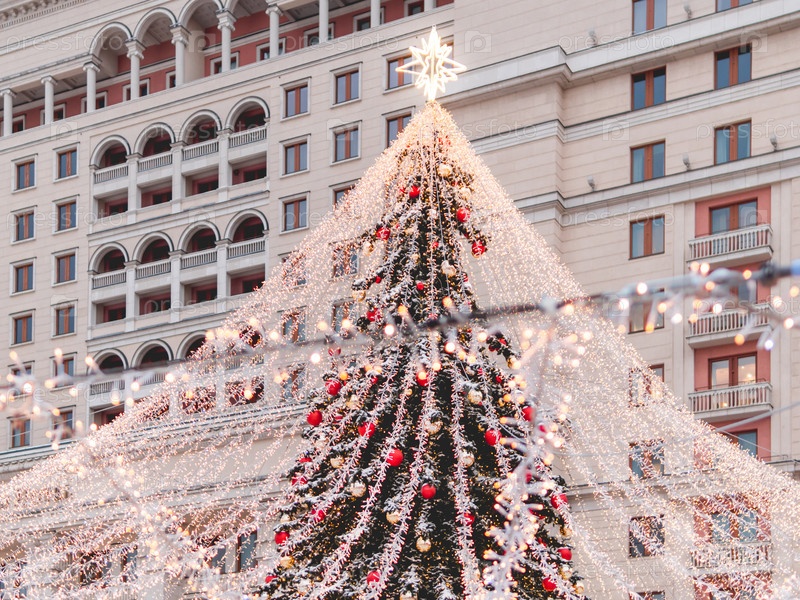 Рождественская елка, украшенная лампочками и ярко-красными шарами. Наружные украшения на елке для празднования Нового года. Москва, Россия