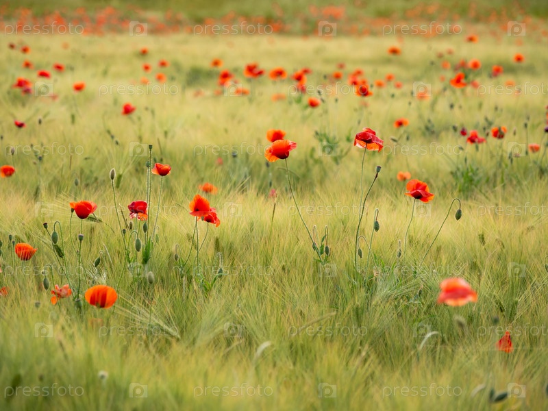 Красные цветы мака на ржаном поле. Зеленые растения с красными бутонами. Красивые и хрупкие цветы летом