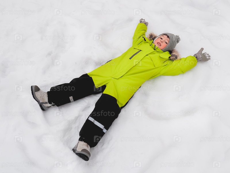 Улыбающийся мальчик в зеленом комбинезоне делает форму снежного ангела на снегу. Радостный ребенок, играющий на открытом воздухе в снежную погоду. Вид сверху на счастливого ребенка в красочном комбинезоне