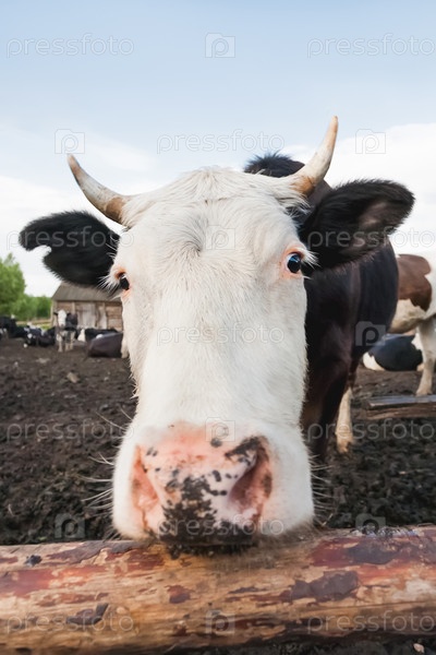 Крупным планом портрет любопытной коровы среди стада коров и быков. Молочные животные пасутся в загоне. Животноводство в сельской местности