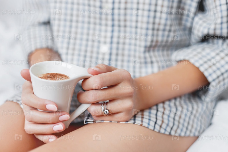 Женщина в клетчатой пижамной рубашке сидит в постели с чашкой горячего кофе. На ее пальце сверкают яркие обручальные и обручальные кольца. Уютный утренний образ жизни