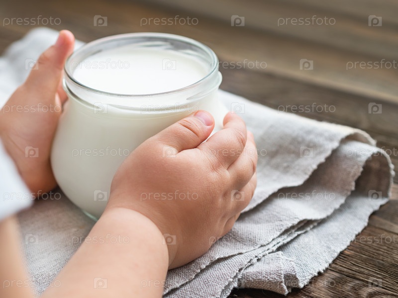 Натуральный домашний йогурт в стеклянной банке. Здоровая еда на завтрак в руках ребенка. Малыш держит банку со сметаной на льняной скатерти на деревянном столе