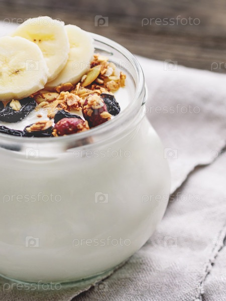 Натуральный домашний йогурт в стеклянной банке. Здоровая еда на завтрак с мюсли. Баночка с мюсли и кусочками банана на льняной скатерти на деревянном столе