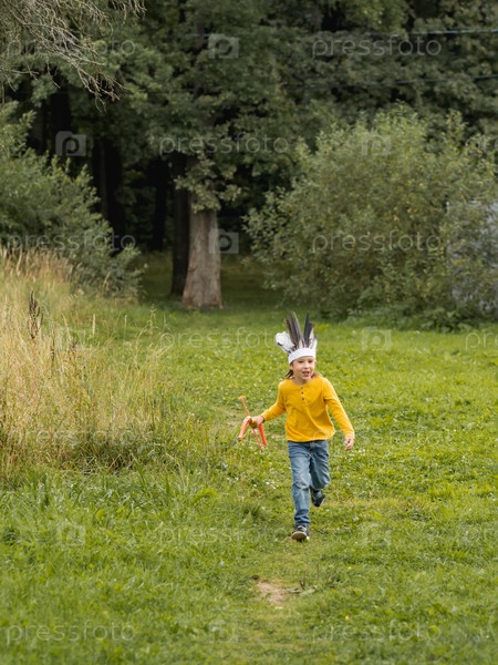 Бегущий мальчик играет в американских индейцев на поле. У малыша ручной головной убор из перьев и лук со стрелами. Костюмированная ролевая игра. Активный отдых на свежем воздухе. Осенний сезон