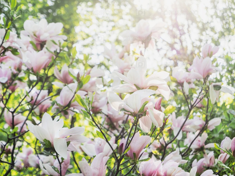 Солнце светит сквозь листву и розовые цветы магнолии Сьюзан. Естественный весенний фон с цветущими цветами