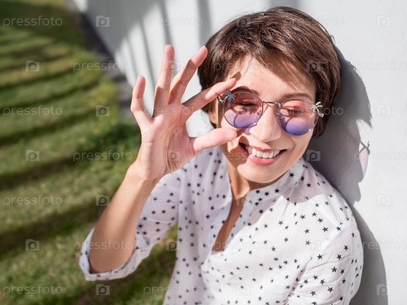Улыбающаяся женщина в красочных солнцезащитных очках отдыхает на лужайке в городском парке. Природа в городе. Отдохните на свежем воздухе после работы. Летние вибрации