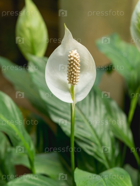 Белый цветок спатифиллума или спата. Цветущая лилия мира. Цветущее растение растет в теплице или дома, освещенном солнечным светом